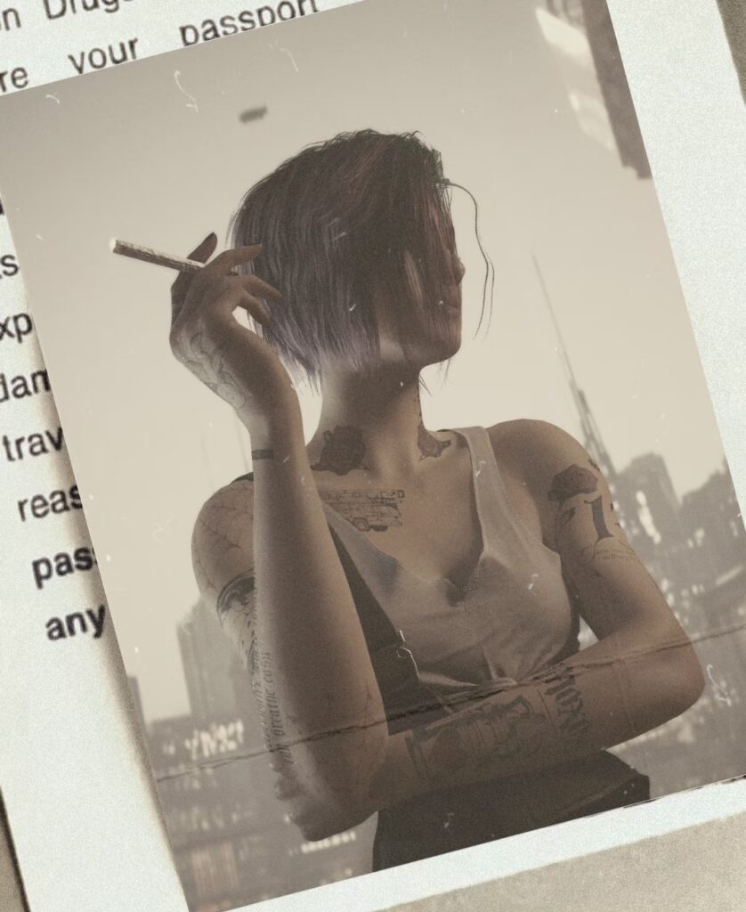 Judy kept on living, same as always, after I bought the farm. Sometimes, she’d just park herself in a coffee shop, eyes glazed over, staring at the blaring holo-ads across the street, their light bleeding onto the bar we used to hit up. Sometimes she’d jolt, like she was gonna sprint to a gig, but then just sag back down. She was still cutting Braindances, scrambling for more eddies, anything to ditch Night City. Took every gig she could get, jamming her neuralware with chaotic B.D.s, trying to burn out the memory of me just vanishing.